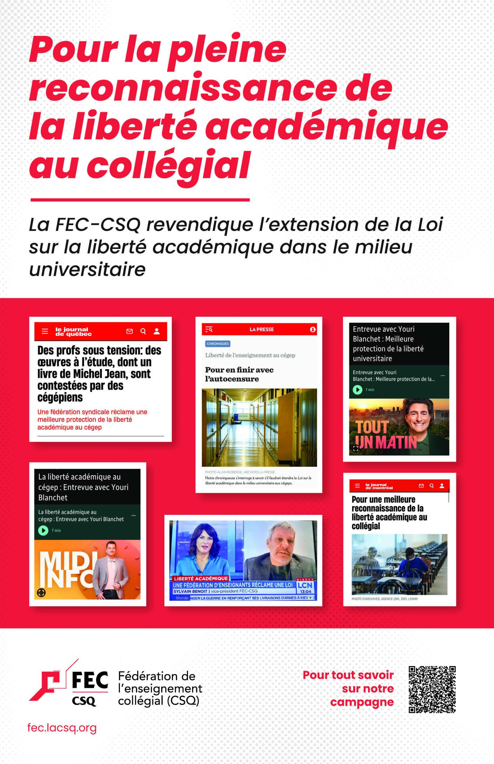 [6]FEC-CSQ, Liberté académique : la FEC-CSQ demande l'extension des dispositions législatives aux cégeps - Fédération de l’enseignement collégial (FEC-CSQ), juin 2024.